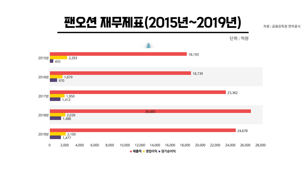 다음은 2015년부터 2019년까지 팬오션의 재무제표를 한눈에 볼 수 있도록 정리한 그래프입니다.