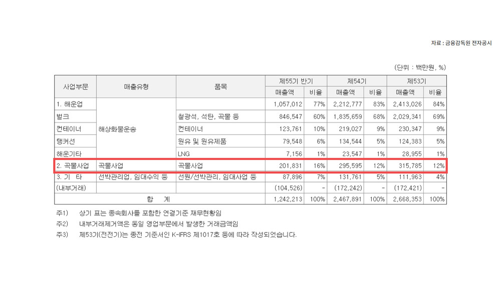 실제로 지난 14일 하림 지주가 공개한 반기보고서에 따르면 팬오션의 상반기(1~6개월) 곡물사업 매출액은 2018억 원으로 매출 비율은 16%까지 늘었습니다.
