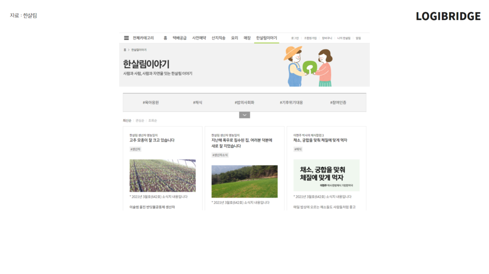 또 하나 재밌는 점은 한살림 온라인몰은 무신사의 매거진과 유사한 형태로, 판매 이외에 '요리' '소식지' 등의 카테고리를 통해 소비자와 생산자가 함께 호흡하는 소통의 창구가 있다는 점입니다.