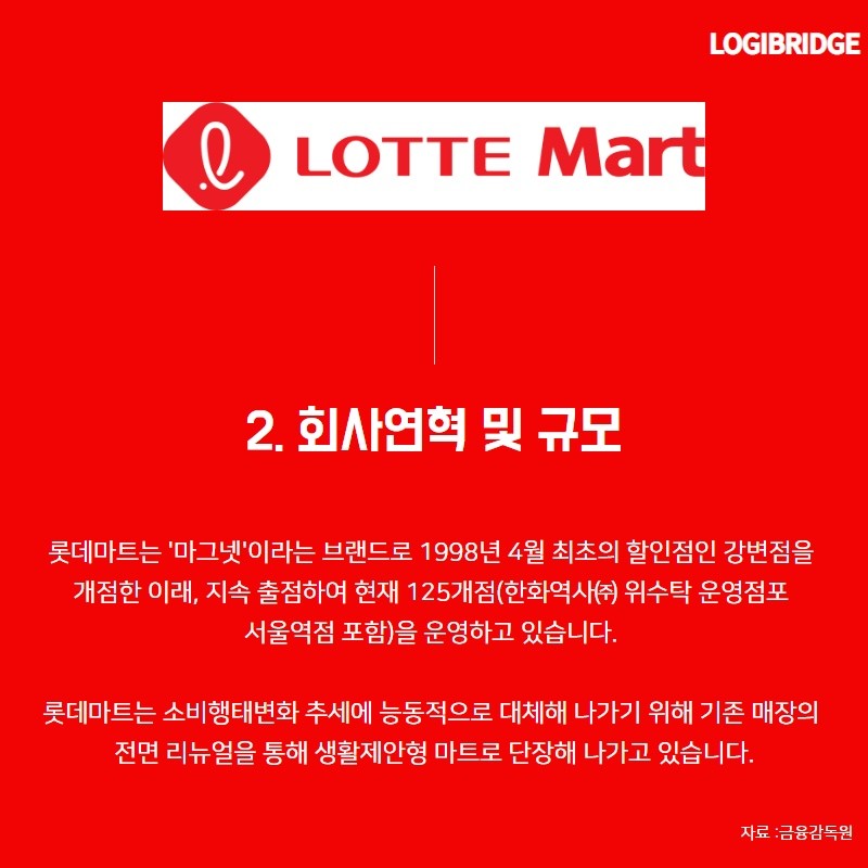 롯데마트는 '마그넷'이라는 브랜드로 1998년 4월 최초의 할인점인 강변점을 개점한 이래, 지속 출점하여 2019년 2분기말 현재 125개점을 운영하고 있습니다.