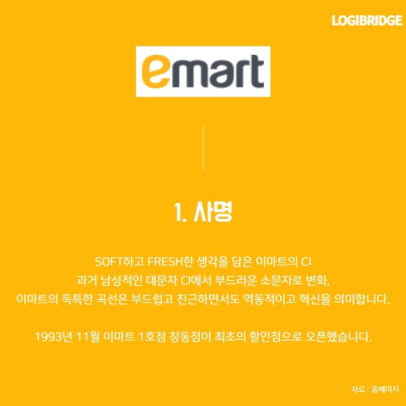 SOFT하고 FRESH한 생각을 담은 이마트의 CI 과거 남성적인 대문자 CI에서 부드러운 소문자로 변화, 이마트의 독특한 곡선은 부드럽고 친근하면서도 역동적이고 혁신을 의미합니다.