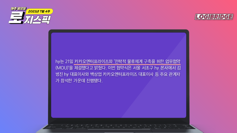 지난 21일에는 카카오엔터프라이즈와 전략적 물류체계 구축을 위한 업무협약을 체결하겠다고 밝히면서 물류사업 확대에 속도를 내는 모습입니다.
