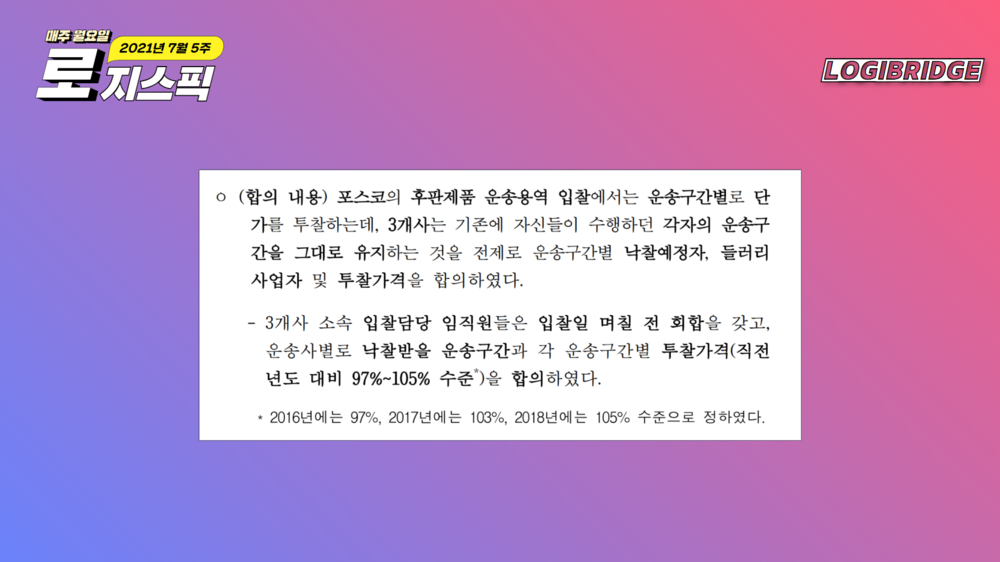 지금까지 공정위가 적발한 담합행위는 2018년 이전에 발생했던 사건들로, 앞으로 물류기업간 운송 담합 행위는 점점 더 쉽지 않을 것으로 예상됩니다.