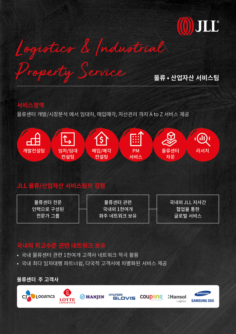 JLL 코리아의 물류산업 자산 서비스팀은 JLL이 상업용 부동산 서비스 전반에 수년간 축적된 폭넓은 네트워크, 노하우와 강점을 기반으로, 물류 부동산 임차·임대 컨설팅, 매입·매각 자문 컨설팅, 물류 개발 컨설팅, 리서치 서비스, 자산관리 서비스 등을 아우르는 고객 맞춤형 토털 물류 서비스를 제공합니다.