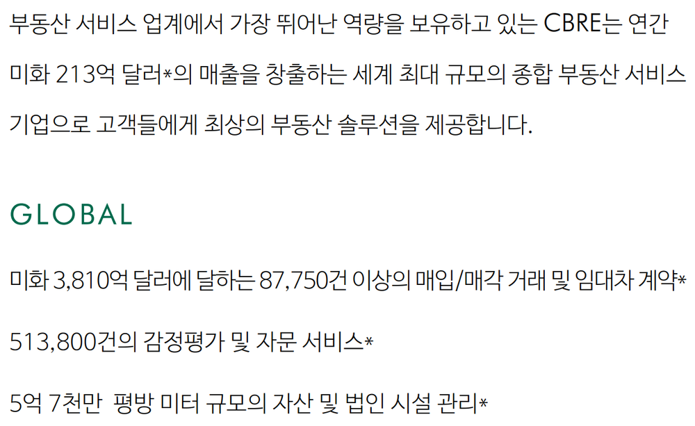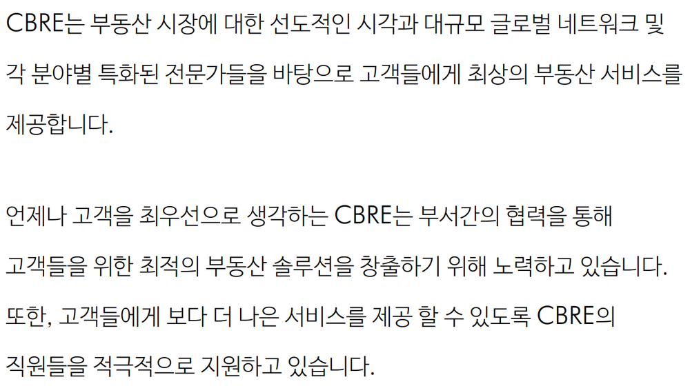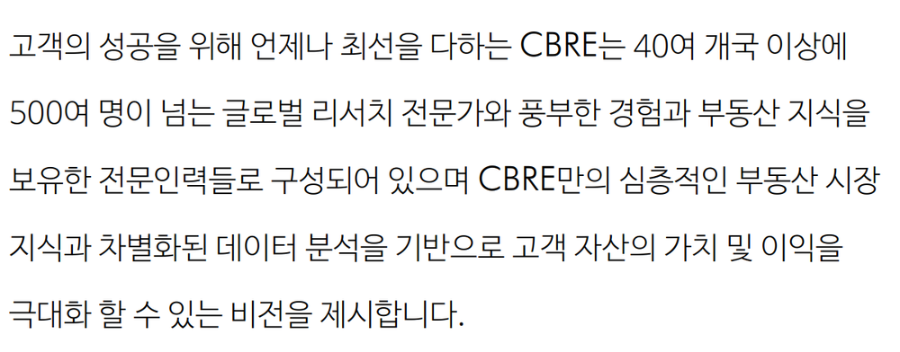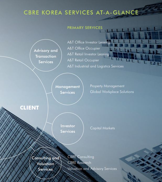 언제나 고객을 최우선으로 생각하는 CBRE코리아는 임대차 자문, 매입/매각 자문, 자산관리, 기업 부동산 통합 솔루션, 자산 가치 평가 및 컨설팅 등 핵심 비즈니스 부서 간의 긴밀한 협력을 통해 고객들을 위한