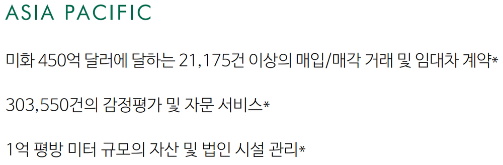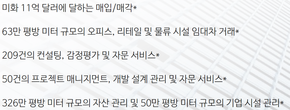 부동산 시장에 대한 풍부한 경험과 지식을 갖춘 400명 이상의 전문 인력과 탄탄한 글로벌 네트워크를 바탕으로 고객의 비즈니스 목표에 부합하며 자산 가치를 극대화할 수 있는 최상의 솔루션을 제공합니다.