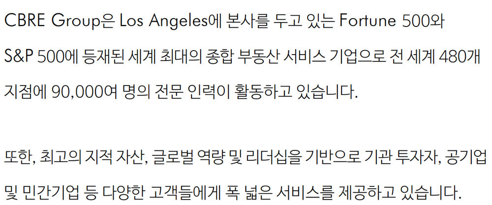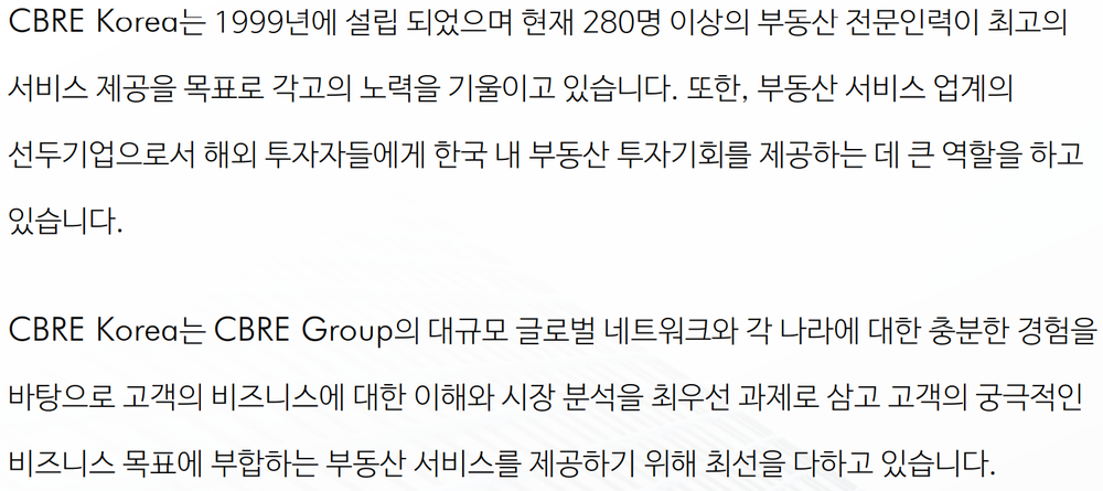 1999년 국내 시장에 진출한 CBRE코리아는 상업용 부동산 시장에서 지속적인 성장세를 기록하며 부동산 서비스 업계의 선두 기업으로 자리 잡았으며