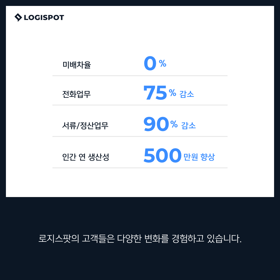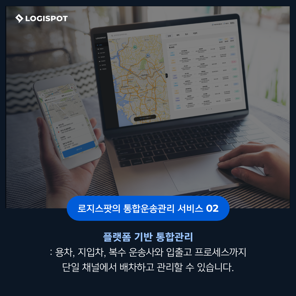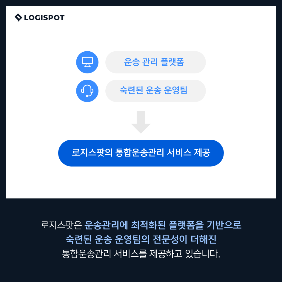 TMS 도입을 통한 효율은 높은 비용을 요구합니다. 운송중개서비스를 통해 기업들은 다양한 지역에 다양한 차량을 섭외하여 물품을 운송하는 것이 가능하지만 관리의 체계가 없는 기존 서비스 형식은 많은 서류작업과 생산성 저하를 동반합니다. 로지스팟은 그간 양립할 수 없었던 두 가지 형태의 서비스를 통합운송관리 서비스라는 새로운 운송 모델을 통해 제시합니다. 실시간 경제로 소비자에게 더 빠르고 더 정확하게 도달해야 하는 디지털 격변의 시기, 로지스팟의 통합운송관리 서비스를 통해 물류 프로세스의 혁신을 앞당기세요.