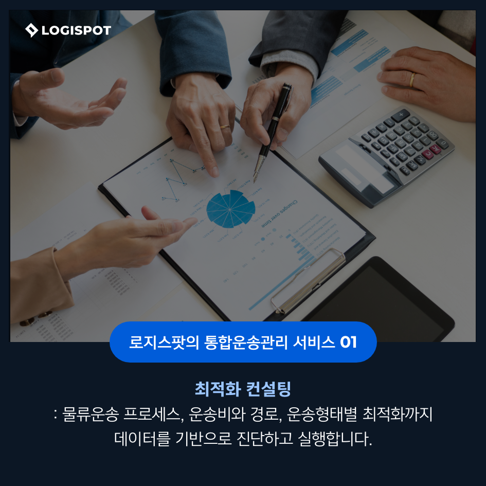 로지스팟은 물류 프로세스의 관점에서 화주의 현재 운송 현황을 파악해 운송이 필요한 물품과 구간에 따른 운송비와 차량종류 등 관련 제반사항들을 살피고 사전에 최적화하는 컨설팅을 제공합니다.