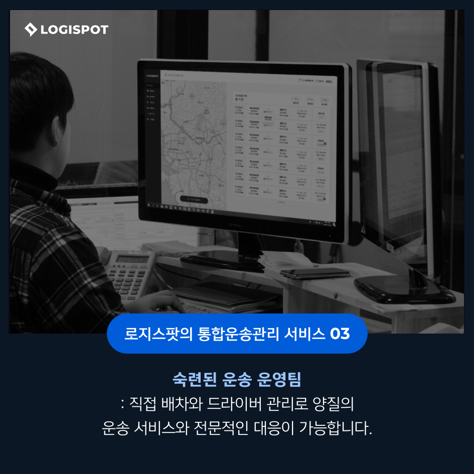 차량수배와 추적까지 운송 플랫폼과 데이터를 토대로 진행하기 때문에 체계적이고, 화물이 이동하는 과정과 도착까지의 전 여정에 대해 책임 배차가 가능합니다.