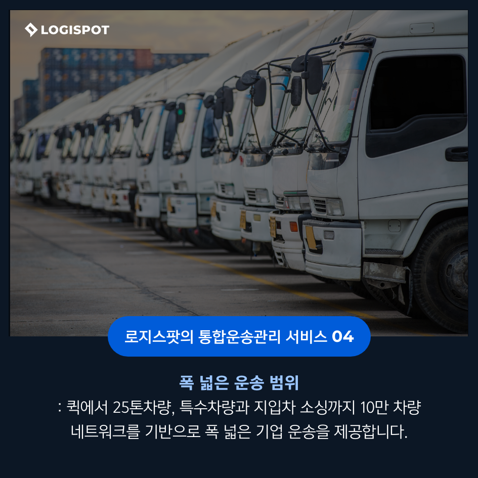 통합운송관리 서비스는 운송프로세스 전반에 대한 가시성을 확보할 수 있는 플랫폼을 기반으로 다양한 형태의 차량을 섭외하고 차주와 기업고객 사이의 커뮤니케이션을 원활히 하는 운송중개공급자의 서비스를 제공합니다.