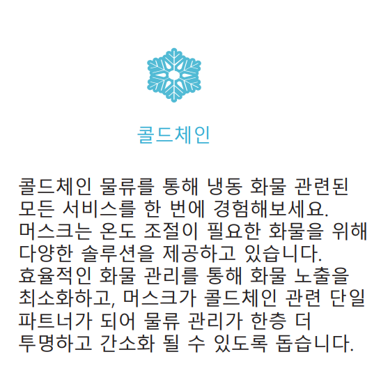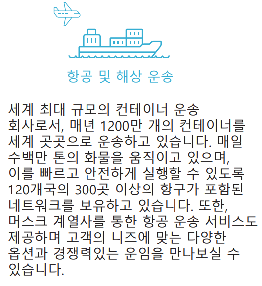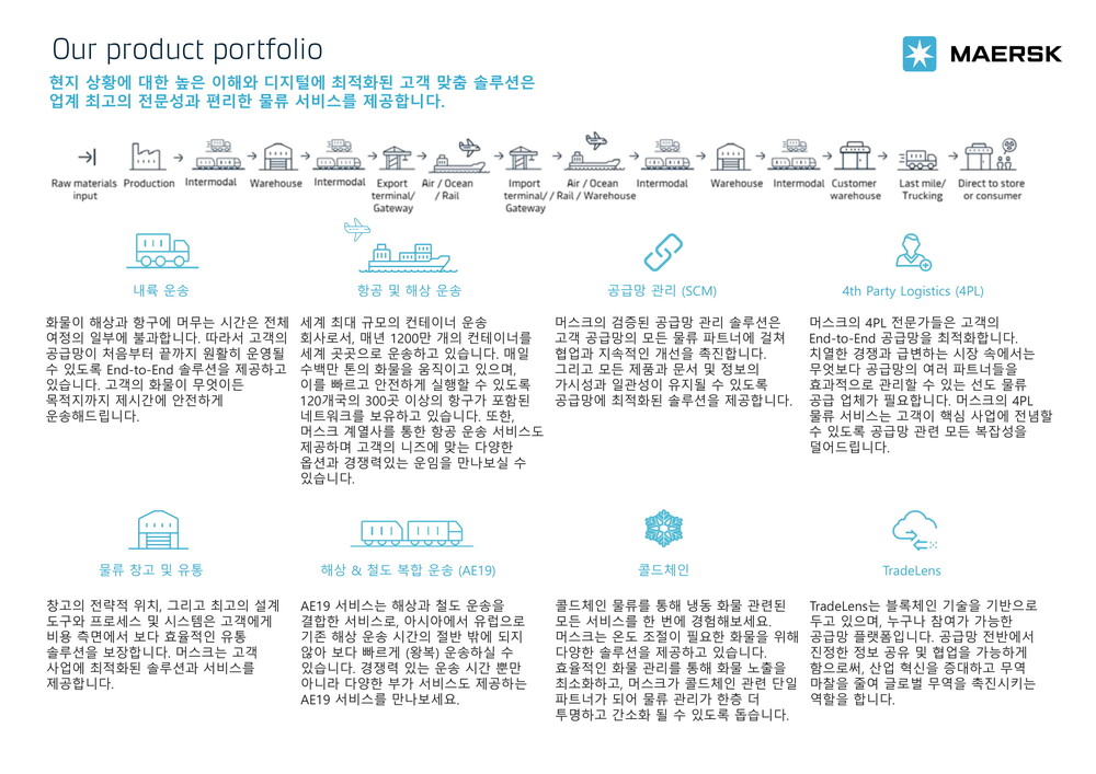 머스크는 통합 물류서비스 및 화물 운송을 통해 고객의 비즈니스 성장을 돕습니다.