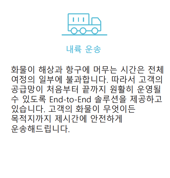 화물이 해상과 항구에 머무는 시간은 전체 여정의 일부에 불과합니다. 따라서 고객의 공급망이 처음부터 끝까지 원활히 운영될 수 있도록 End-to-End 솔루션을 제공하고 있습니다. 고객의 화물이 무엇이든 목적지까지 제시간에 안전하게 운송해드립니다.