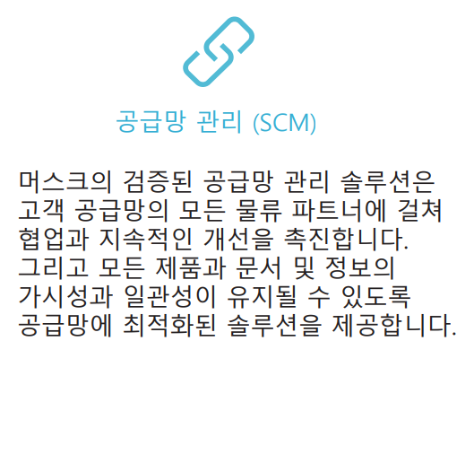머스크의 검증된 공급망 관리 솔루션은 고객 공급망의 모든 물류 파트너에 걸쳐 협업과 지속적인 개선을 촉진합니다. 그리고 모든 제품과 문서 및 정보의 가시성과 일관성이 유지될 수 있도록 공급망에 최적화된 솔루션을 제공합니다.