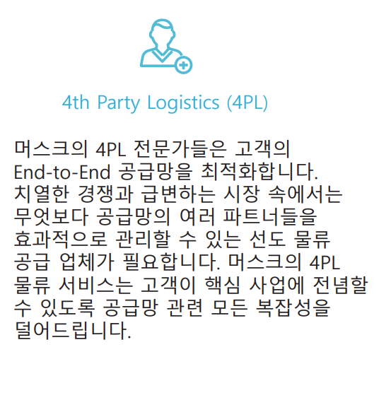 머스크의 4PL 전문가들은 고객의 End-to-End 공급망을 최적화합니다. 치열한 경쟁과 급변하는 시장 속에서는 무엇보다 공급망의 여러 파트너들을 효과적으로 관리할 수 있는 선도 물류 공급 업체가 필요합니다. 머스크의 4PL 물류 서비스는 고객이 핵심 사업에 전념할 수 있도록 공급망 관련 모든 복잡성을 덜어드립니다.