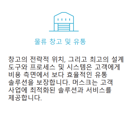 창고의 전략적 위치, 그리고 최고의 설계 도구와 프로세스 및 시스템은 고객에게 비용 측면에서 보다 효율적인 유통 솔루션을 보장합니다. 머스크는 고객 사업에 최적화된 솔루션과 서비스를 제공합니다