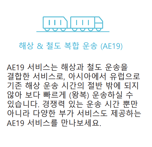 AE19 서비스는 해상과 철도 운송을 결합한 서비스로, 아시아에서 유럽으로 기존 해상 운송 시간의 절반 밖에 되지 않아 보다 빠르게 (왕복) 운송하실 수 있습니다. 경쟁력 있는 운송 시간 뿐만 아니라 다양한 부가 서비스도 제공하는 AE19 서비스를 만나보세요.