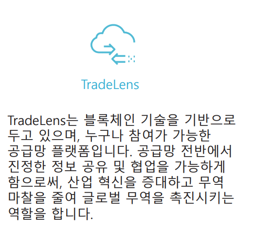 TradeLens는 블록체인 기술을 기반으로 두고 있으며, 누구나 참여가 가능한 공급망 플랫폼입니다. 공급망 전반에서 진정한 정보 공유 및 협업을 가능하게 함으로써, 산업 혁신을 증대하고 무역 마찰을 줄여 글로벌 무역을 촉진시키는 역할을 합니다.