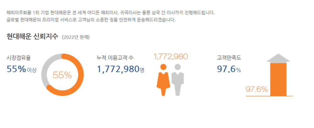 이를 바탕으로 업계 최초 누적 이용고객 100만 명 돌파는 물론 해외이주 화물운송 시장점유율 55% 이상을 차지하는 명실공히 글로벌 운송 기업으로 우뚝 설 수 있었습니다.