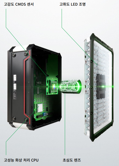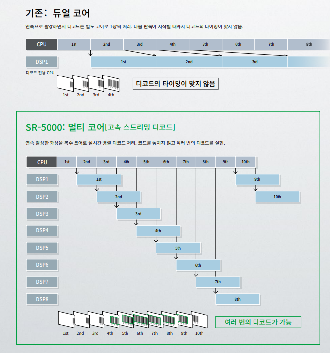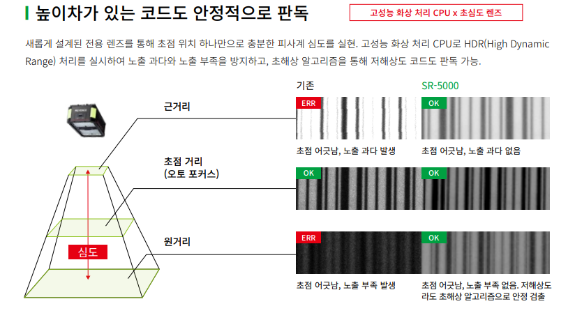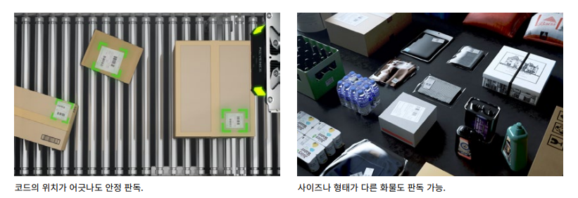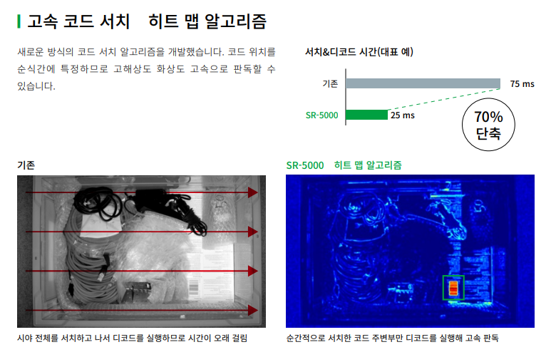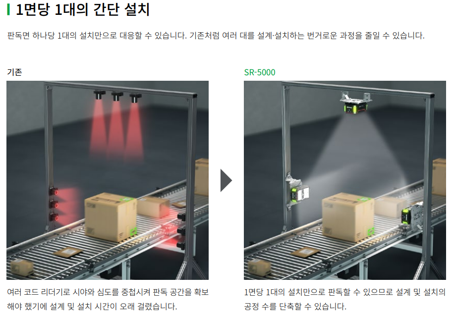 초광시야·초심도로 초고속 판독의 간단 도입·운용을 실현하는 물류 코드 리더기 SR-5000 시리즈는 물류 현장에서 고속으로 이동하는 화물의 코드를 확실하게 포착합니다. 사이즈나 형상, 바코드 라벨의 위치가 다른 화물이 동시에 고속으로 반송되어도 안정적으로 판독할 수 있습니다. 화물의 방향 조정 등 사전 준비 공정이 불필요하므로 반송 장비 간소화를 통해 불량 리스크 감소 및 비용 절감도 실현합니다. 또한 기존에는 1면에 여러 대의 리더기가 필요했지만 SR-5000 시리즈는 초광시야·초심도를 통해, 1면에 1대씩 설치하는 것만으로도 다양한 사이즈·위치인 화물의 윗면과 측면에 부착된 라벨의 코드를 한꺼번에 일괄 판독할 수 있습니다.