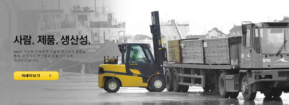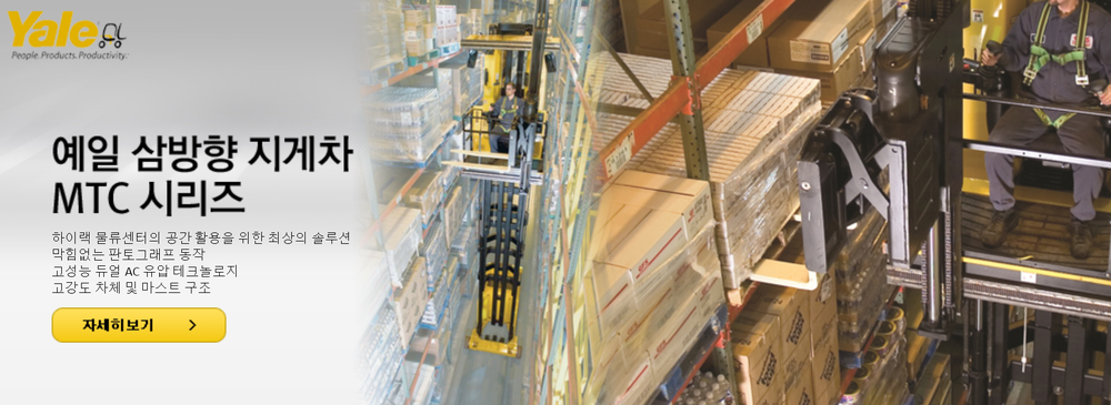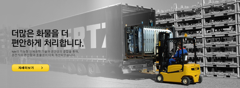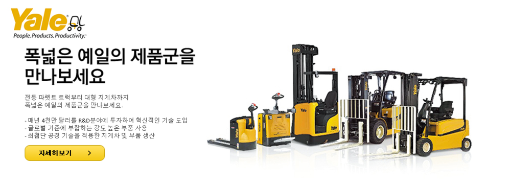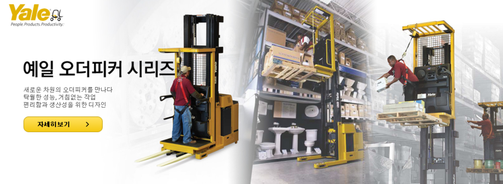 Yale의 모든 장비는 사람, 제품, 생산성(Tagline - People, product, productivity)에 초점을 맞추어 인체공학적인 설계를 바탕으로 제작되며, 신속한 물류작업과 생산성 향상을 이루어 냅니다. 예일의 제품들은 AC모터 사용으로 뛰어난 성능을 발휘함은 물론 케이블 배선을 획기적으로 줄인 CANbus 시스템의 채택으로 손쉬운 사후관리가 이루어집니다. 고효율 물류창고 솔루션에 특화된 삼방향 지게차, 오더피커, 하이리치 트럭 시리즈는 랙과 랙 사이의 좁은 통로에서도 신속하고 편리한 작업 성능을 보장합니다.