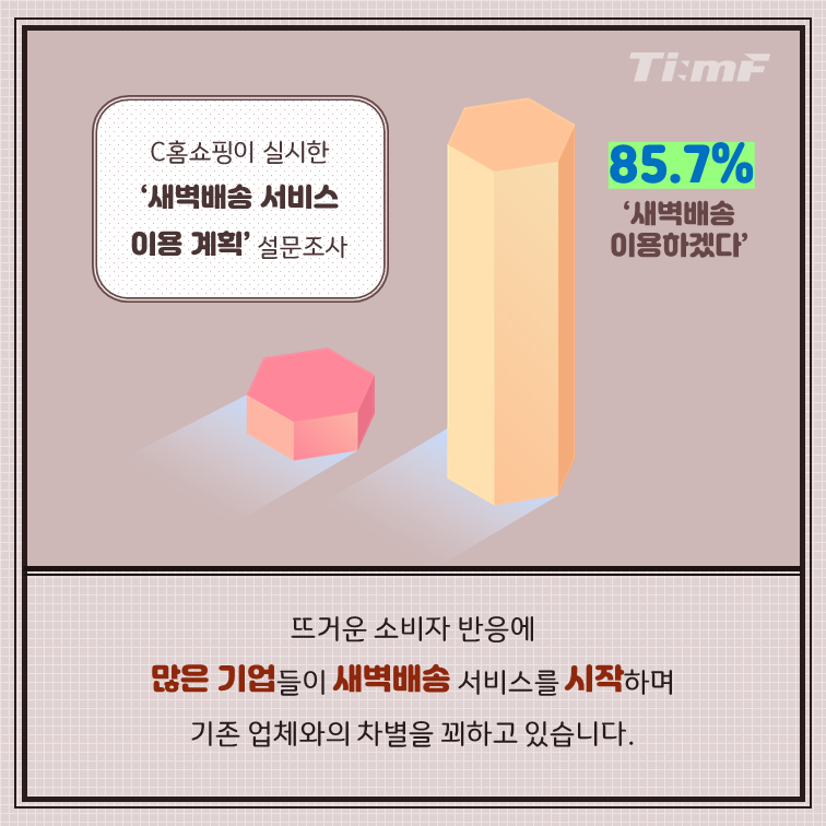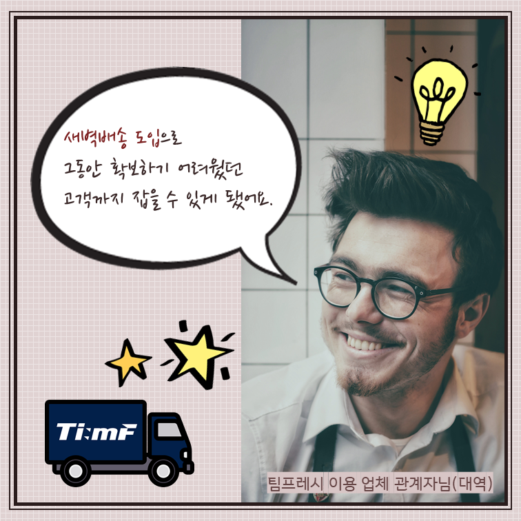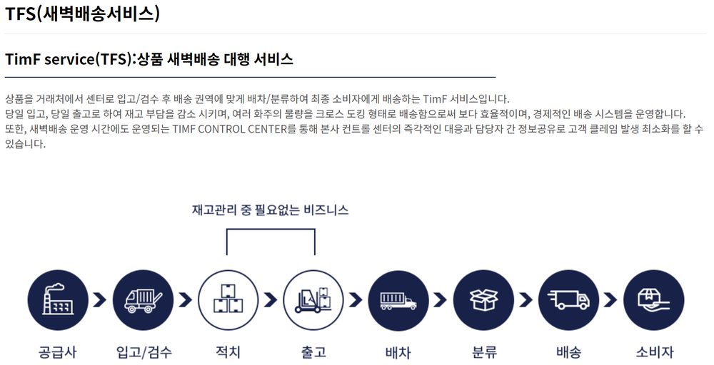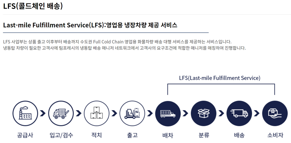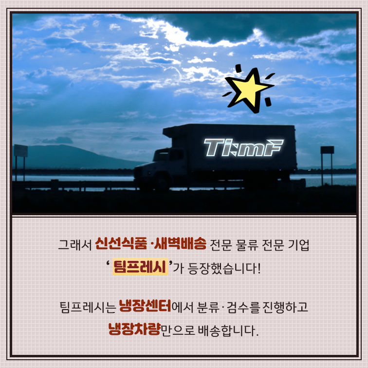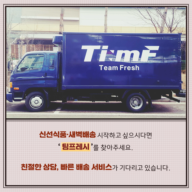 ㈜팀프레시는 대한민국 NO.1 콜드체인 새벽배송 팀프서비스 사업을 중심으로 커머스 물류 주문처리, 운영 컨설팅, 신선식품 3PL, 영업용 냉장차량 배차 서비스 등을 통하여 최상의 서비스를 고객분들께 제공하고 있습니다.