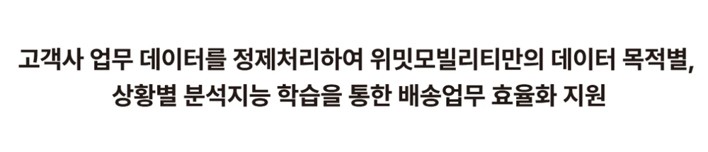 위밋모빌리티는 다수의 차량·이동·경로·배송·업무배정 데이터 등을 통해 모빌리티의 화물 분배 효율화 및 배차 최적화를 제고하는 기업입니다.