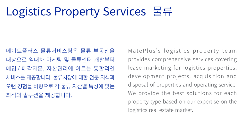 이러한 전문가와 글로벌 서비스 경험을 토대로, 부동산 자산관리에서 각종 임대차 및 매입매각 컨설팅, 리테일 서비스, 리서치&투자자문, 컨설팅 및 평가 서비스, 자산 실사, CM, 물류서비스, NPL 자산관리, 개발사업 및 주거서비스에 이르는 부동산 관련 종합 서비스를 One stop service로 제공합니다. 고객의 투자와 성공의 가치를 최우선으로 추구하는 메이트플러스와 에비슨영 코리아와 함께 하십시오. 고객의 성공과 함께 하겠습니다.