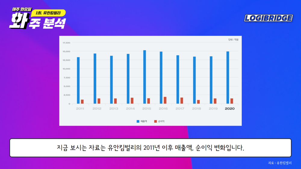 지금 보시는 자료는 유안킴벌리의 2011년 이후 매출액, 순이익 변화입니다.