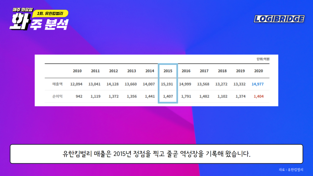 유한킴벌리 매출은 2015년 정점을 찍고 줄곧 역성장을 기록해 왔습니다.