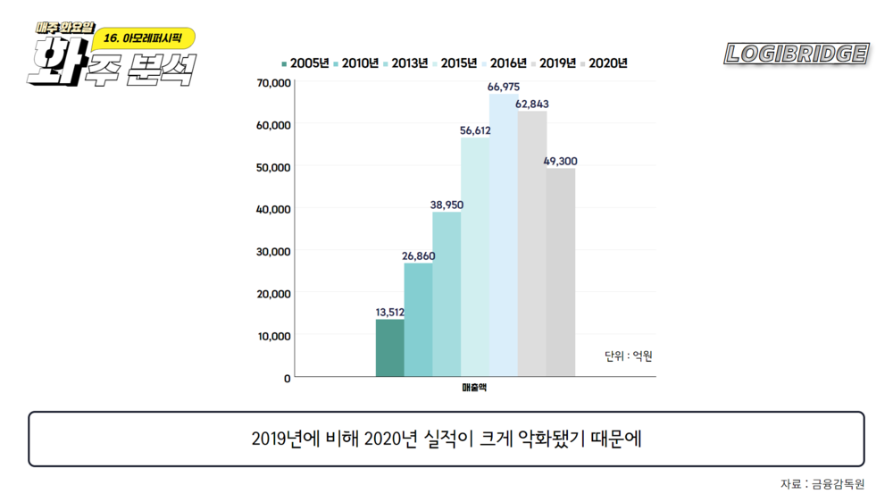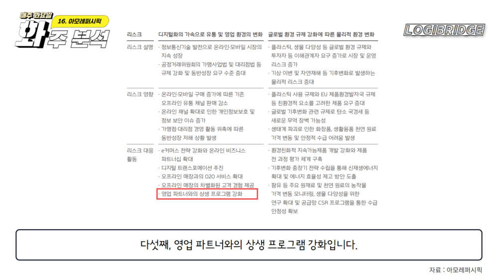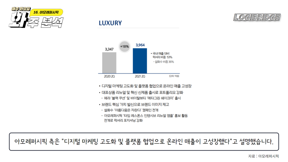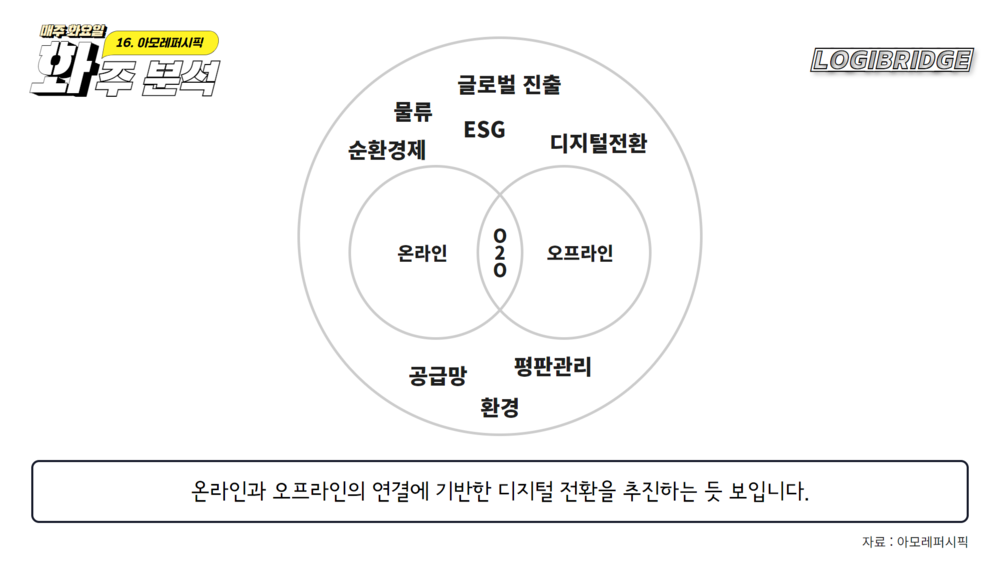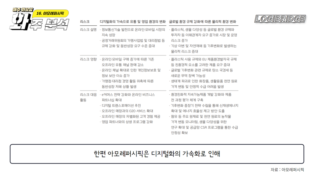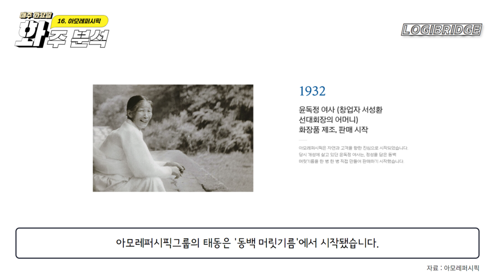 또한 일찍이 생산과 물류를 통합해 안정적으로 공급망(수요 예측 정기 공급 등)을 관리했던 사업전략을 보면, 아모레퍼시픽이 시대를 앞서 나간 통찰력이 있음은 분명해 보입니다.