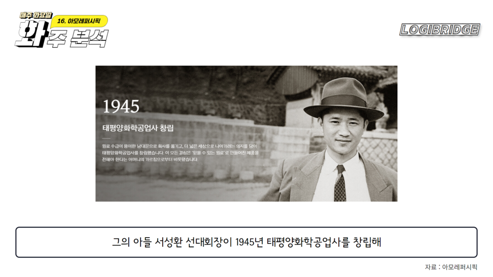 1932년 윤독정 여사(창업자 서성환 선대회장의 어머니)가 동백 머릿기름을 제조해 판매한 것을 시작으로, 그의 아들 서성환 선대회장이 1945년 태평양화학공업사를 창립해 1948년 국내 최초 브랜드 제품 '메로디크림'을 발매했습니다.