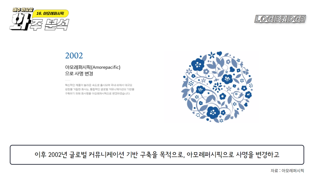 이후 2002년 글로벌 커뮤니케이션 기반 구축을 목적으로, 아모레퍼시픽으로 사명을 변경하고, 2006년 아모레퍼시픽그룹 지주회사 체제로 전환하는 기업 지배구조에 변화를 줬습니다.
