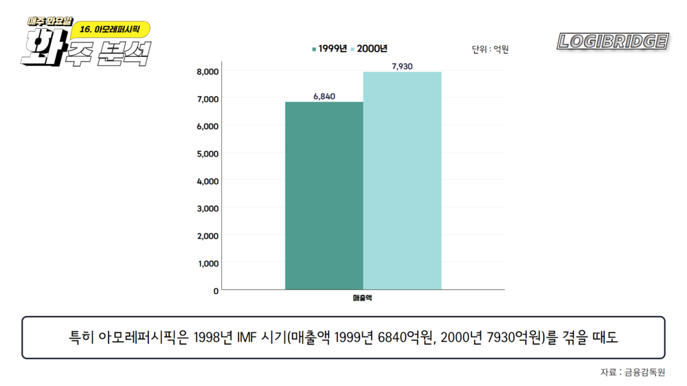 특히 아모레퍼시픽은 1998년 IMF 시기(매출액 1999년 6840억원, 2000년 7930억원)를 겪을 때도 안정적인 성장세를 기록하며 위기를 돌파했습니다.