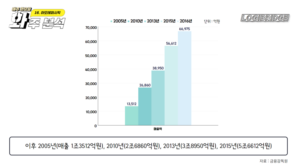 이후 2005년(매출 1조3512억원), 2010년(2조6860억원), 2013년(3조8950억원), 2015년(5조6612억원), 2016년(6조6975억원)까지 해를 거듭하면서 큰 폭의 성장세를 일궜습니다.