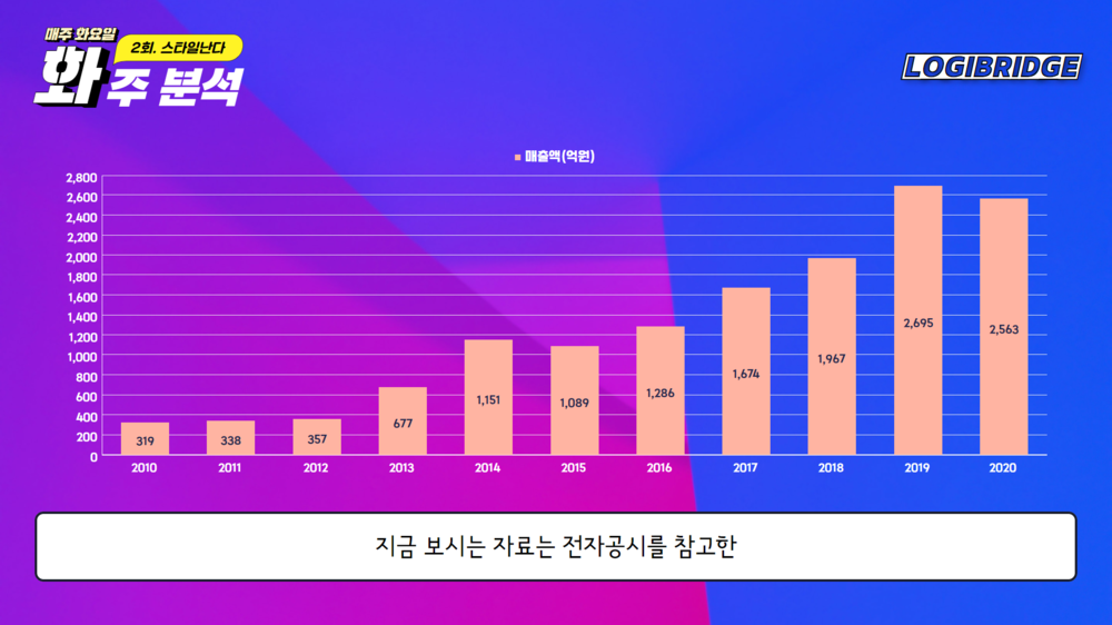 지금 보시는 자료는 전자공시를 참고한, 2010년부터 2020년까지 스타일난다 매출액 변화를 정리한 자료입니다.