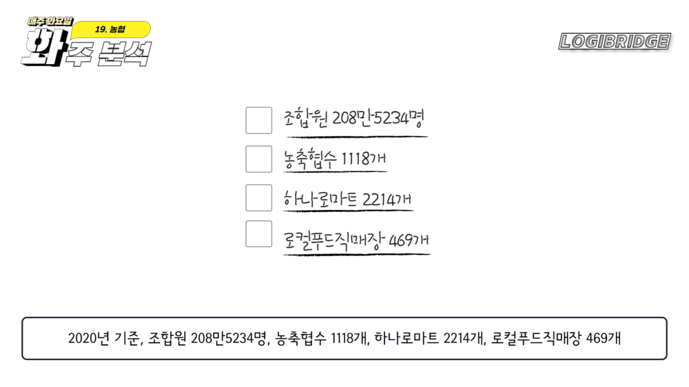 2020년 기준, 조합원 208만5234명, 농축협수 1118개, 하나로마트 2214개, 로컬푸드직매장 469개를 두고 있습니다.