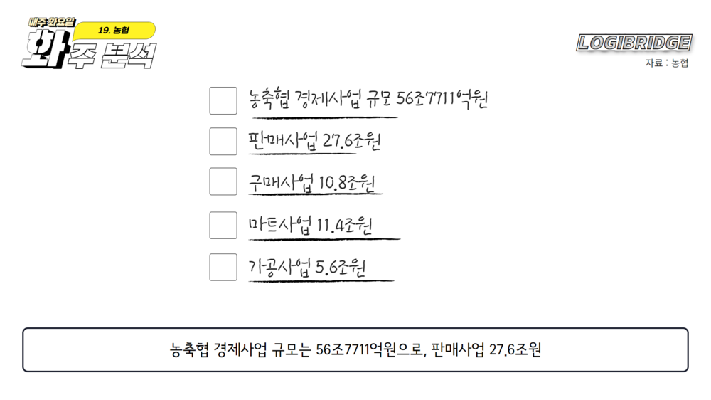 농축협 경제사업 규모는 56조7711억원으로, 판매사업 27.6조원, 구매사업 10.8조원, 마트사업 11.4조원, 가공사업 5.6조원으로 평가됩니다.