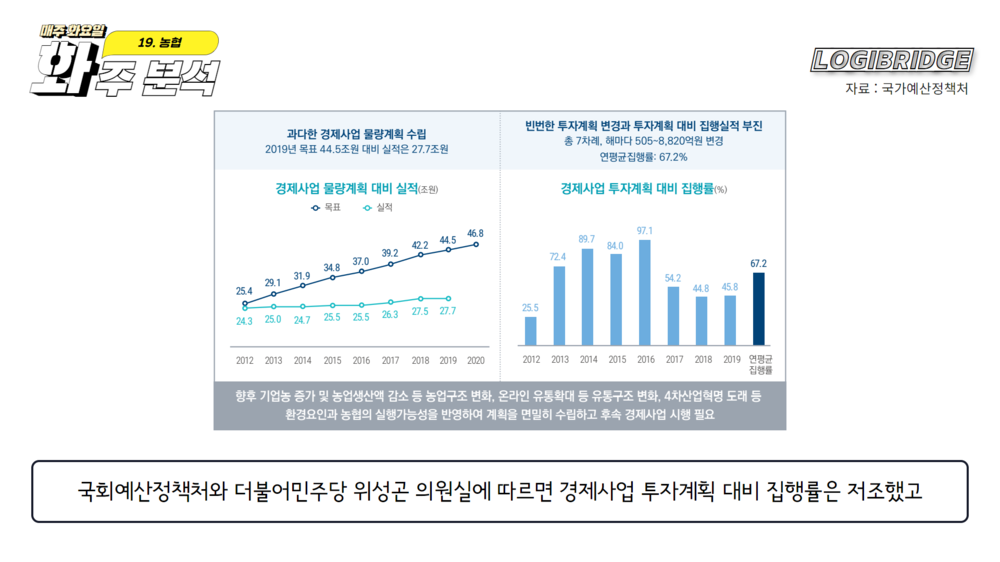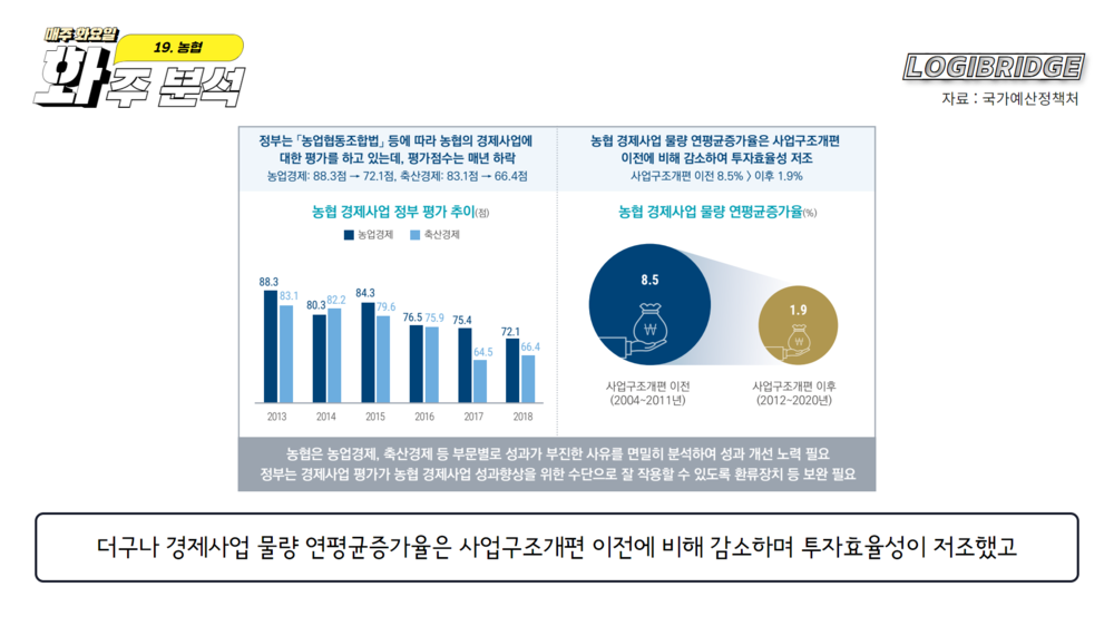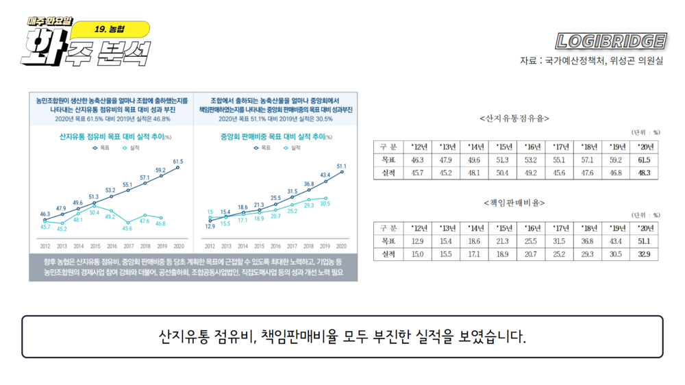 더구나 경제사업 물량 연평균증가율은 사업구조개편 이전에 비해 감소하며 투자효율성이 저조했고, 산지유통 점유비, 책임판매비율 모두 부진한 실적을 보였습니다.