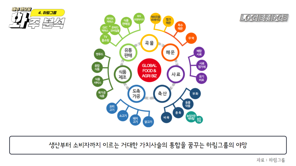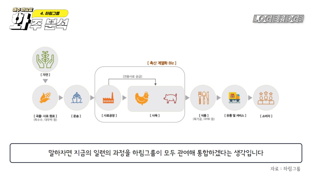 이상 오늘은 해외 곡물 유통부터 해상 운송, 사료배합과 축산, 가공, 나아가 도심물류단지에 기반해 유통과 물류를 결합한 D2C까지 확장하는 하림그룹을 분석해 봤습니다.