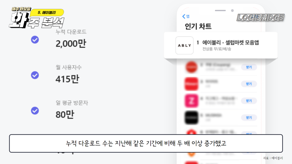 에이블리 측은 론칭 이후 누적 다운로드 수 2000만, 월 사용자 수 415만, 일 평균 방문자 수 80만, 누적 마켓 수 1.4만개를 기록했다고 밝혔는데요.
