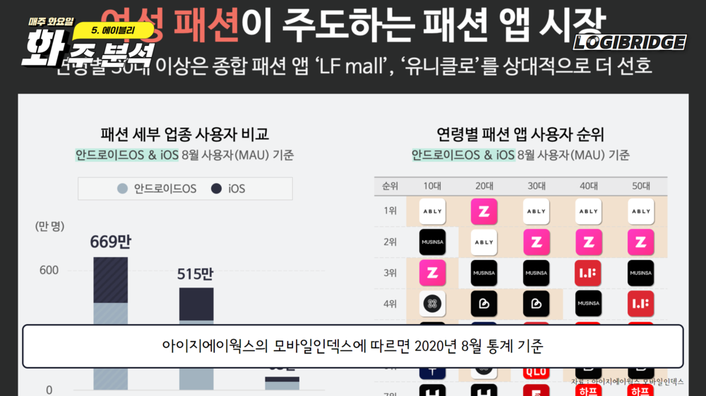 아이지에이웍스의 모바일인덱스에 따르면 2020년 8월 통계 기준, 연령별 패션 앱 사용자 순위 1위를 차지했습니다.