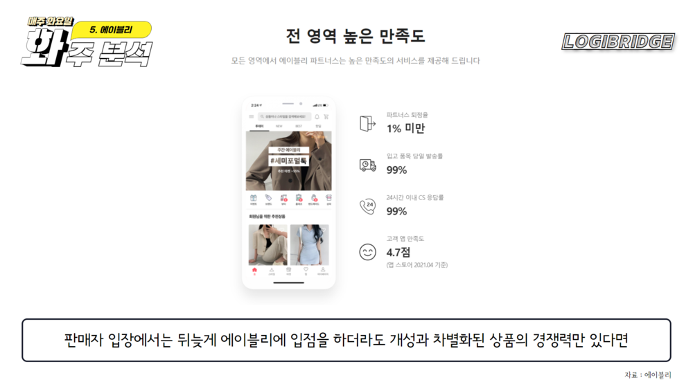 정리하면 에이블리는 단순한 패션 앱이 아닌, 판매자의 공급망 전 과정을 통합적으로 관리하는 솔루션 역할까지 B2C와 B2B 서비스를 동시에 제공하는 큰 그림을 그리는 듯 보입니다.