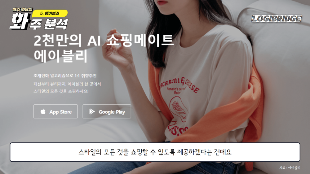 에이블리는 자사를 '2천만의 AI(인공지능) 쇼핑메이트'라고 소개하고 있습니다.