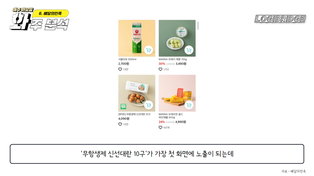6월 1일 기준, 배달의민족 앱에 접속해 B마트 '인기상품'을 보면 '무항생제 신선대란 10구'가 가장 첫 화면에 노출이 되는데,