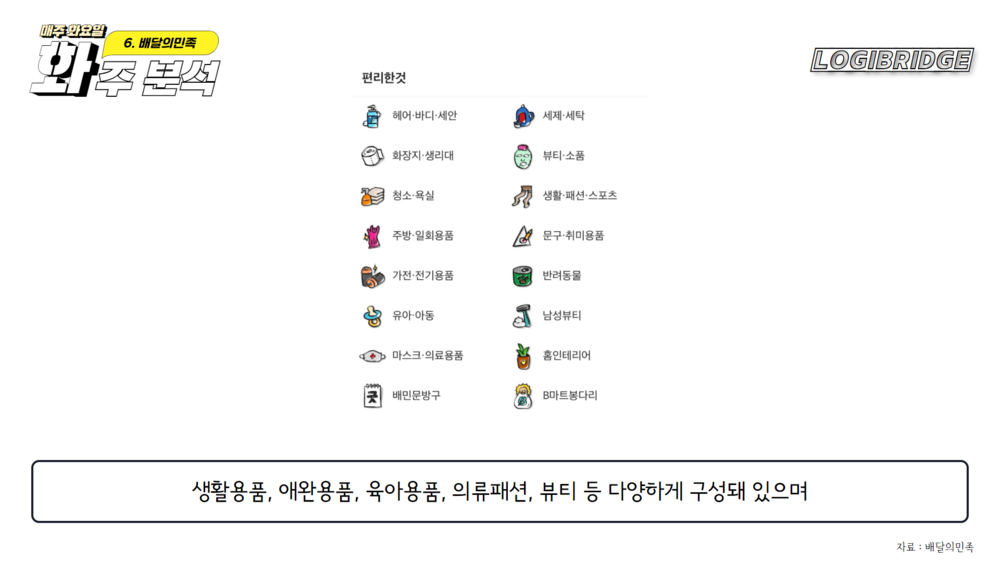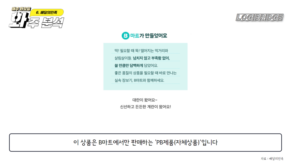 B마트의 상품 카테고리는 밀키트, 가공식품, 신선식품, 냉동/냉장, 생활용품, 애완용품, 육아용품, 의류패션, 뷰티 등 다양하게 구성돼 있으며,배달의민족이 직접 만든 'PB상품'의 종류 또한 점차 늘어나는 추세입니다.