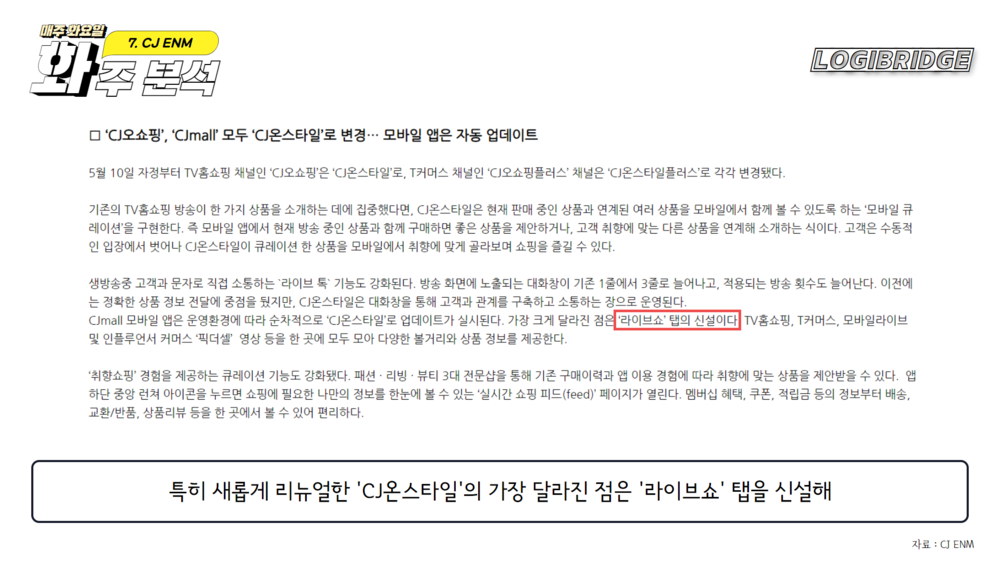 CJ 측 관계자는 2018년 CJ오쇼핑이 CJ ENM을 흡수합병할 당시 언론 인터뷰에서 "급변하는 미디어 커머스 산업 내에서 경쟁력을 높이기 위해 양사의 커머스 역량과 콘텐츠 역량을 집약해 경쟁력을 확보하기 위한 것"이라고 합병의 이유를 밝혔습니다.