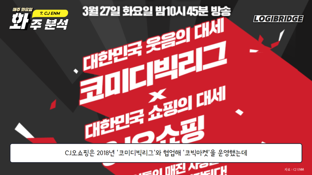 CJ오쇼핑은 2018년 '코미디빅리그'와 협업해 '코빅마켓'을 운영했는데, 약 2시간 동안 4종류의 상품을 판매하고 8억원 가량의 매출을 올린 것으로 알려졌습니다.