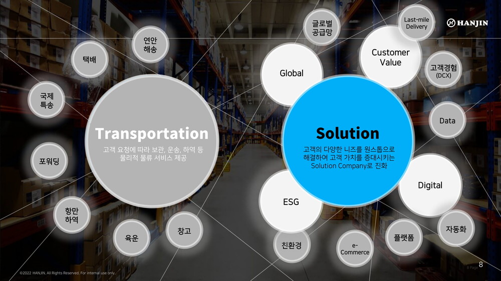 그러나 앞으로의 한진은 고객의 다양한 니즈를 원스톱으로 해결해서 고객의 가치를 증대시키는 솔루션 컴퍼니로 진화하고자 합니다.
