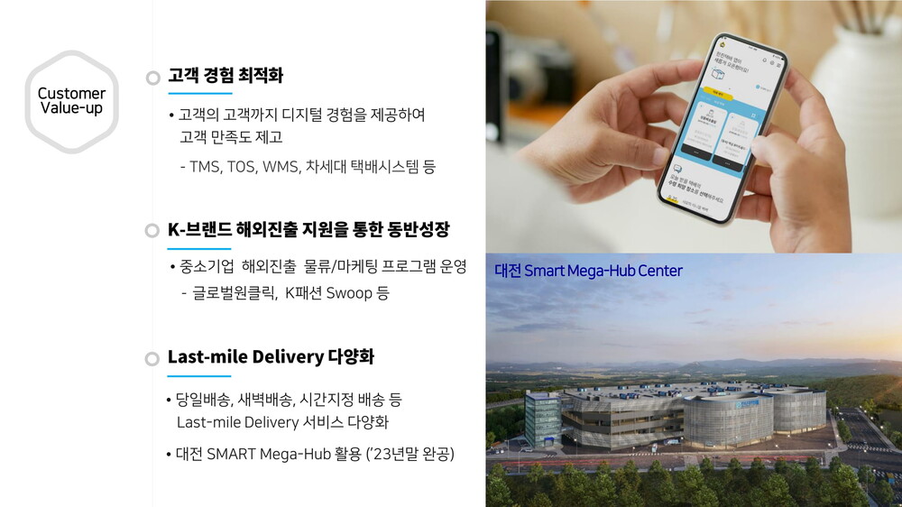최근에 고객들의 다양해진 라스트마일 딜리버리 서비스 요구에 부응해서 당일배송, 새벽배송, 시간지정 배송 등 라스트마일 딜리버리 서비스를 다양화하겠습니다.